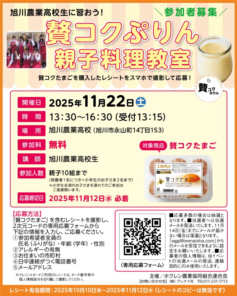 この菓子博に合わせて旭川農業高校生がホクレン贅コクたまごを使ったプリンを開発し販売いたしました。 約10ヶ月かけて完成した贅コクぷりんは大好評で即完売!